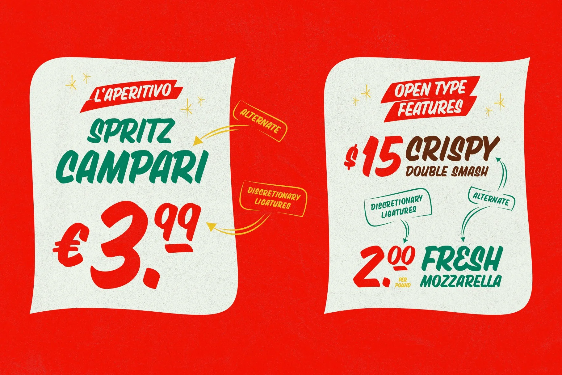 Broccolini is a typeface based on sign painting strokes with rounded corners and a handmade flavour. Letterforms are inspired by Casual sign painting style which was used on shops and markets signs. Its bold strokes make it a perfect choice for advertising, packaging and logotypes with style!