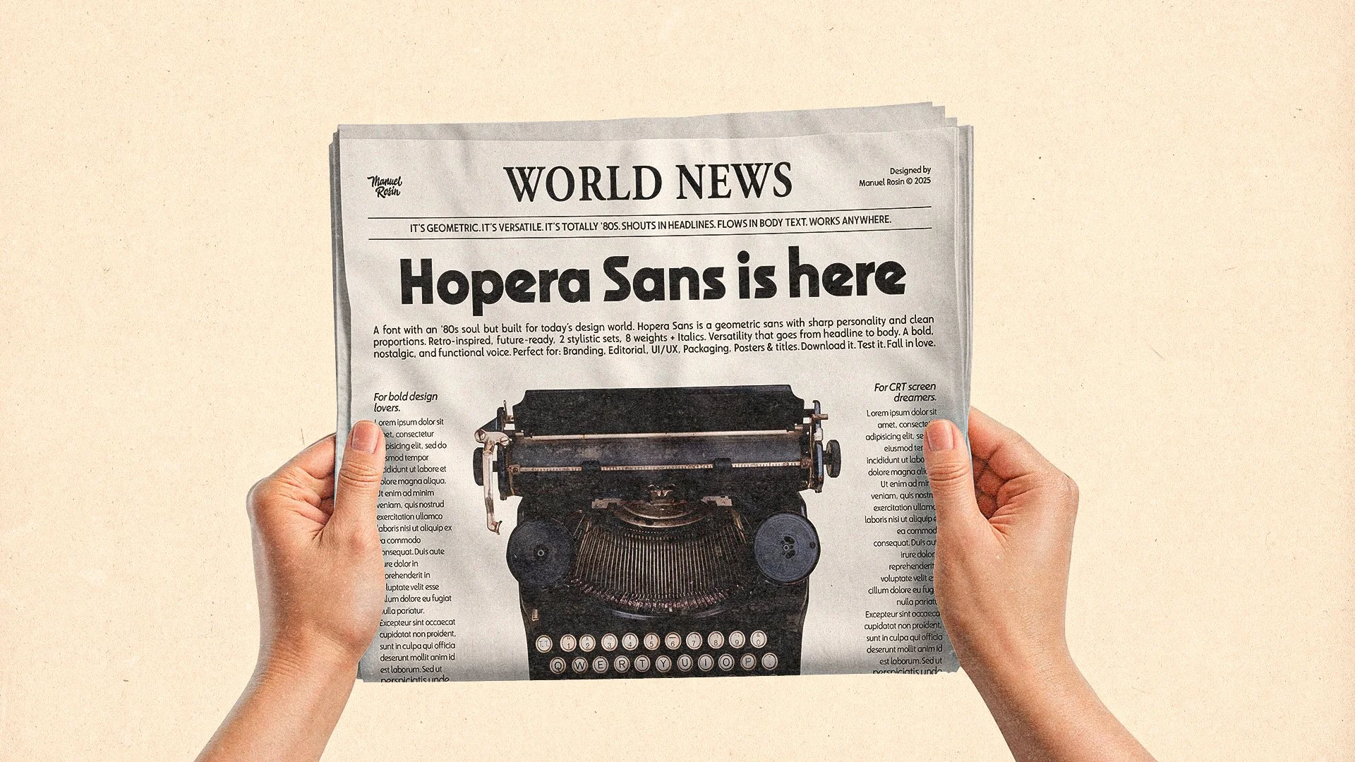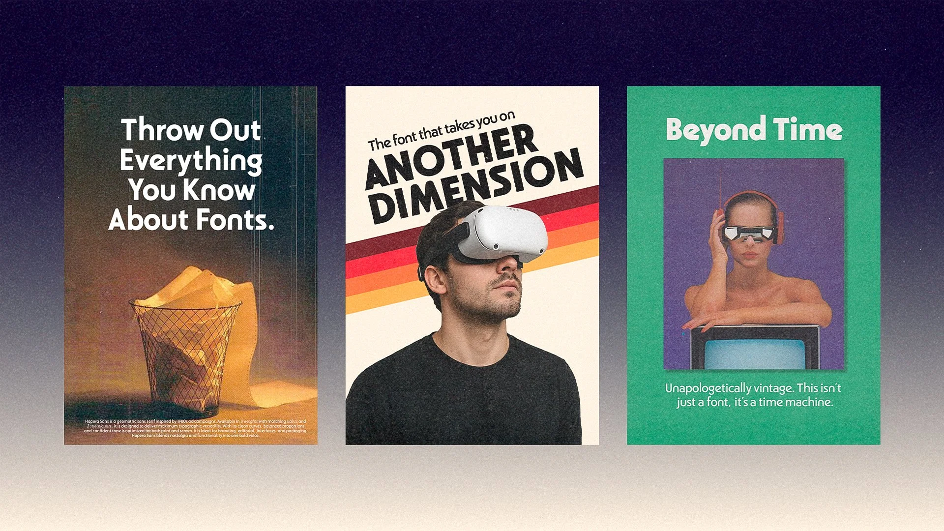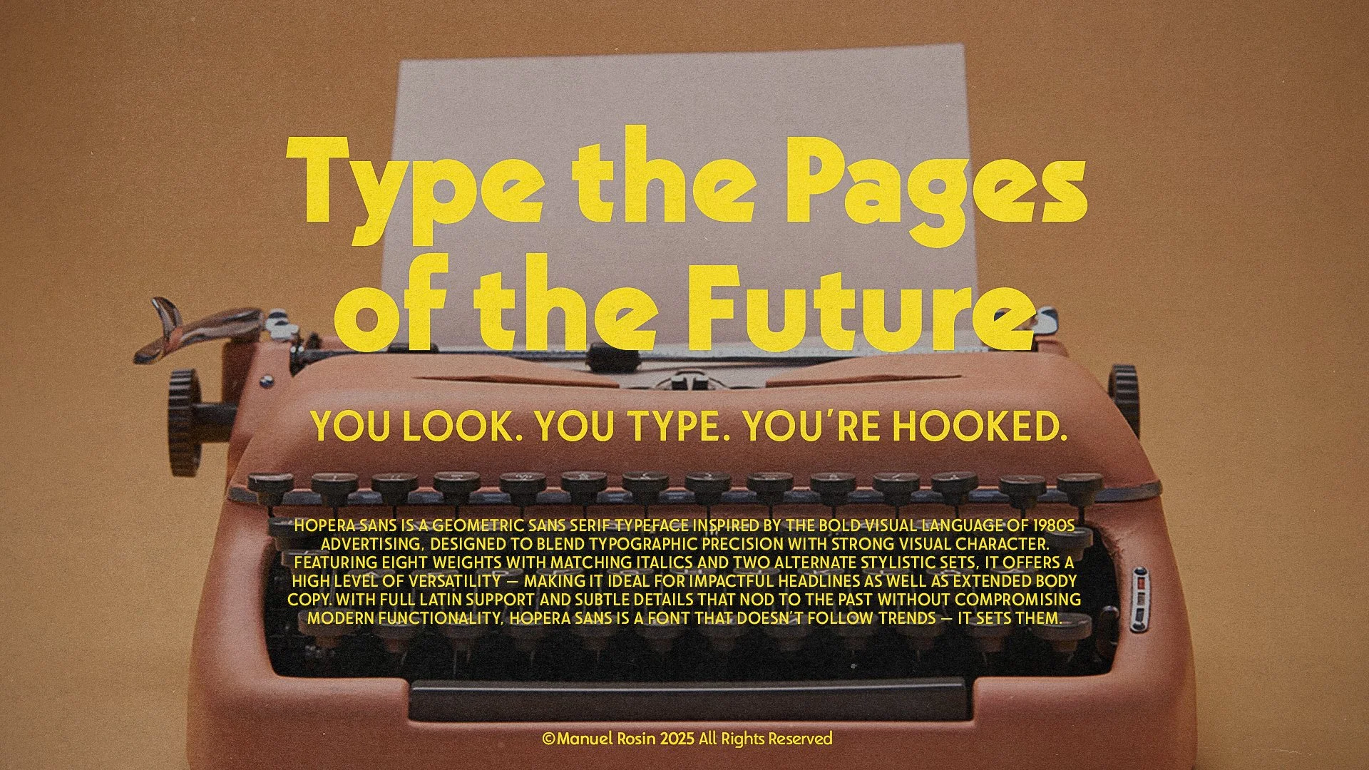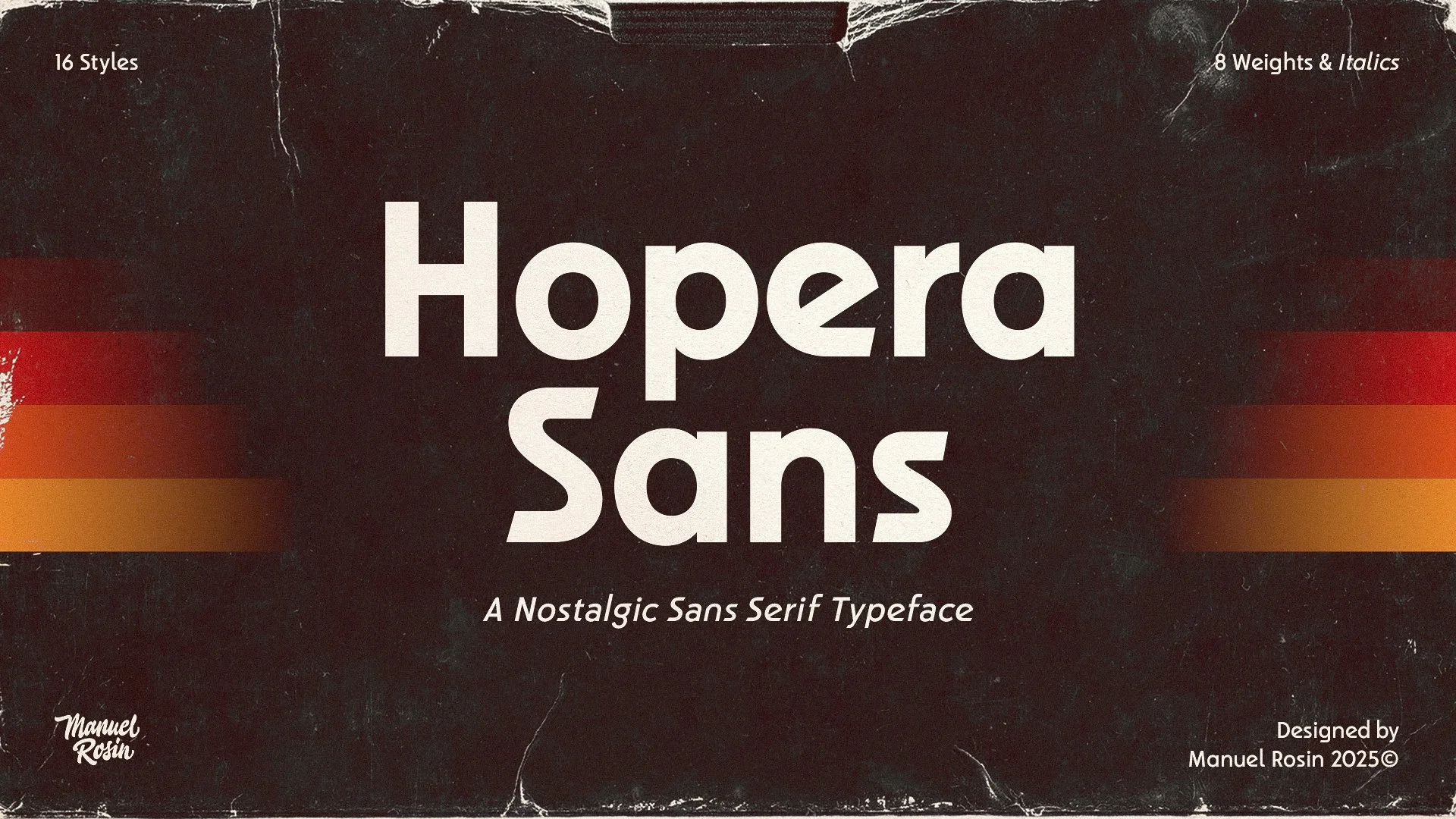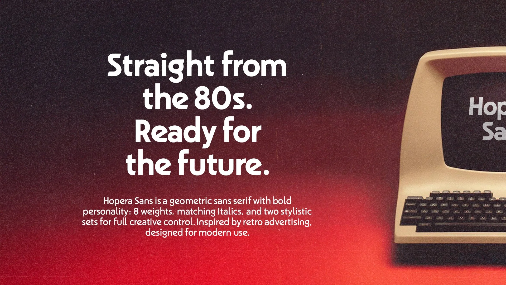 Hopera Sans is a geometric sans serif typeface inspired by the bold visual language of 1980s advertising, designed to blend typographic precision with strong visual character. Featuring eight weights with matching italics and two alternate stylistic sets, it offers a high level of versatility — making it ideal for impactful headlines as well as extended body copy. Its clean forms, balanced construction, and retro edge make it a perfect fit for branding, editorial design, packaging, and digital interfaces.