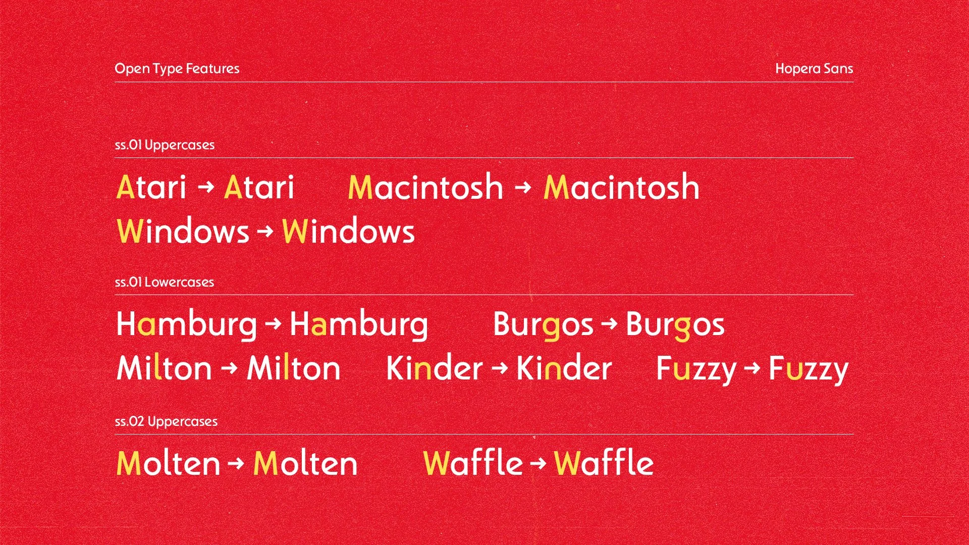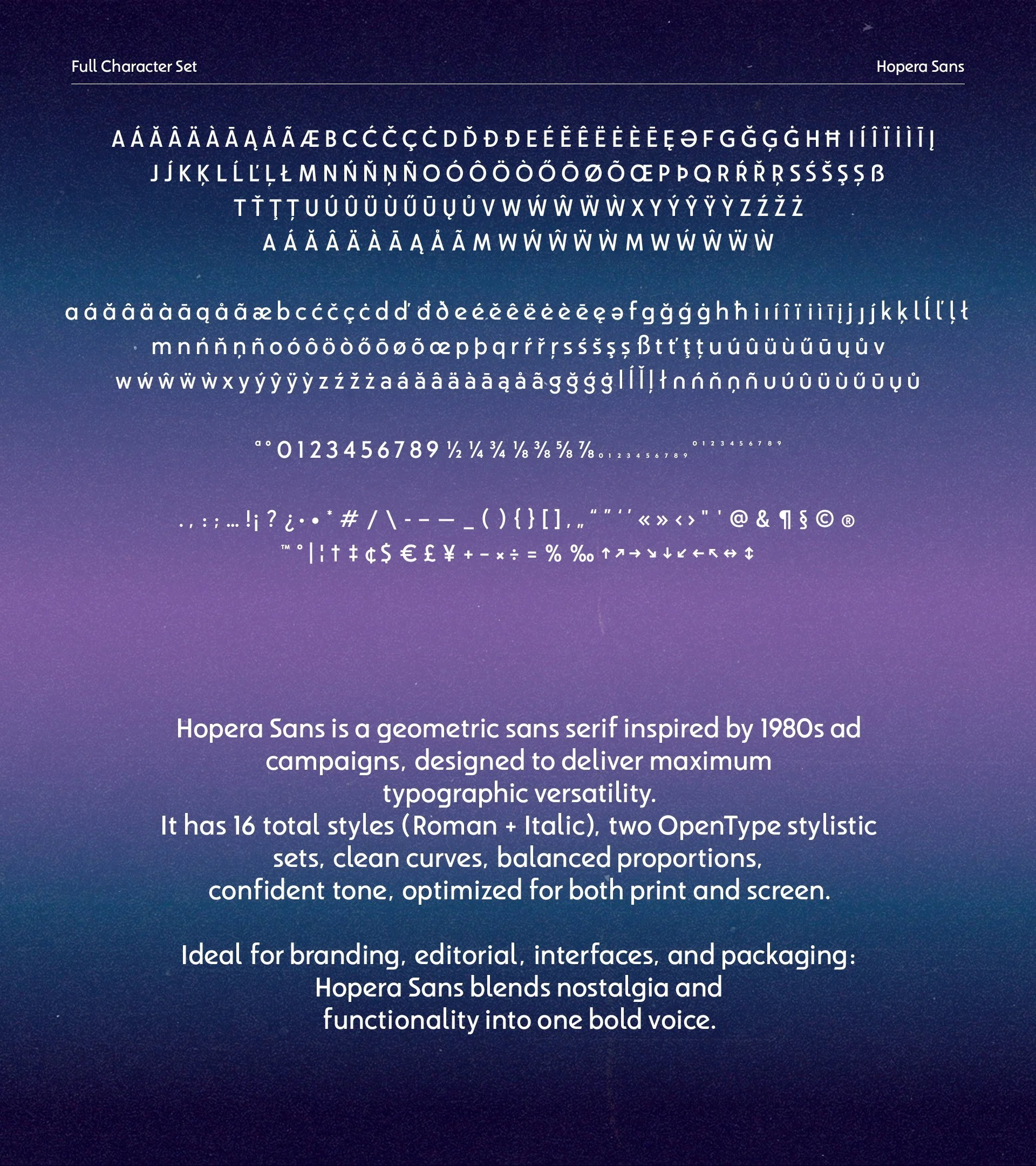Hopera Sans is fully optimized for both print and screen, with full Latin support and subtle details that nod to the past without compromising modern functionality.